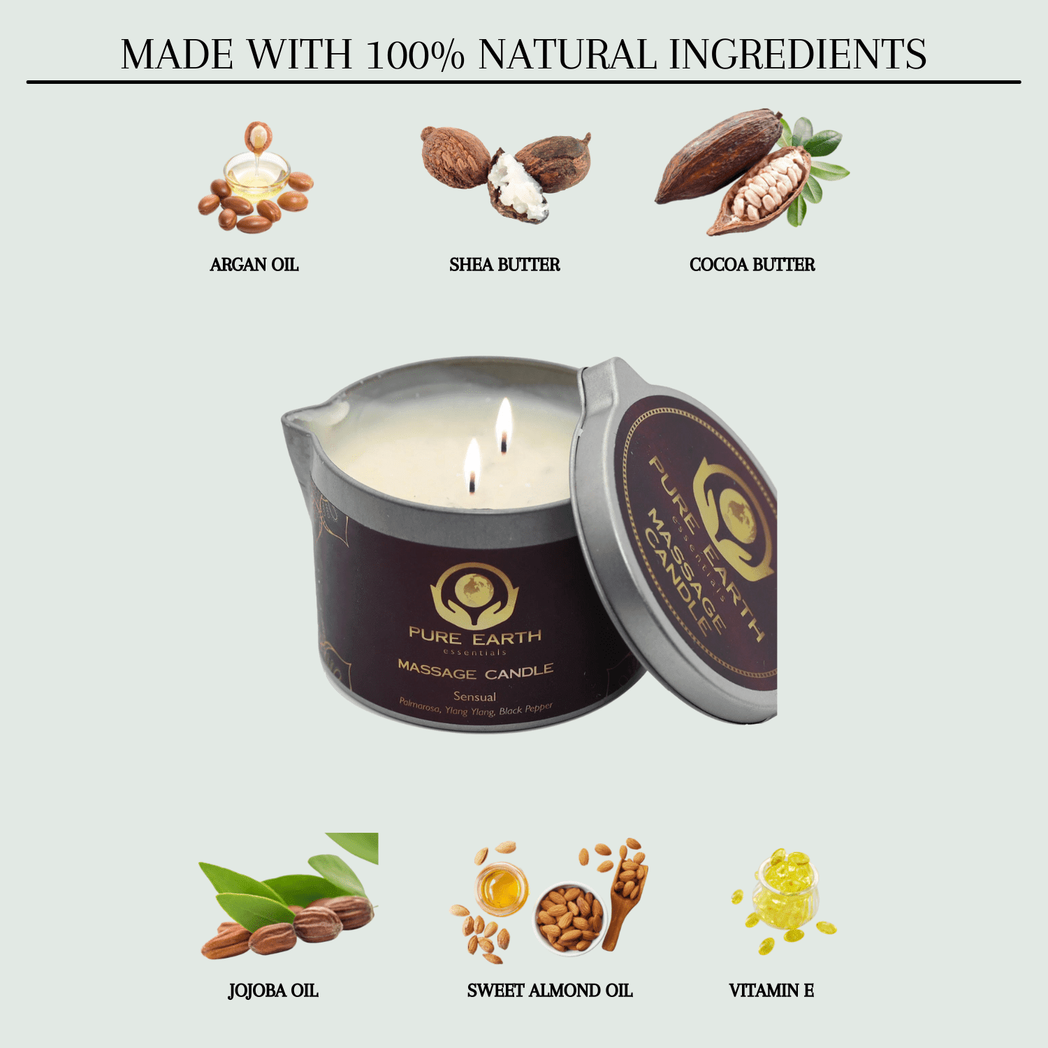 Pure earth essentials massage candle is natural & vegan with key active ingredients of cocoa, shea butter, argan, jojoba, sweet almond oil & vitamin e for nourished and moisturized skin.